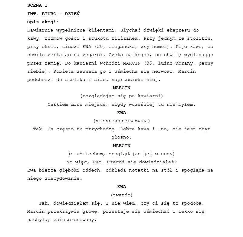 - Nazwa postaci i dialog: Kiedy postać ma coś do powiedzenia, jej imię umieszczamy wyśrodkowane, powyżej kwestii dialogowej. Sam dialog jest również wyśrodkowany, ale z węższym marginesem niż opis akcji. Staraj się, aby dialogi były naturalne i oddawały charakter postaci.